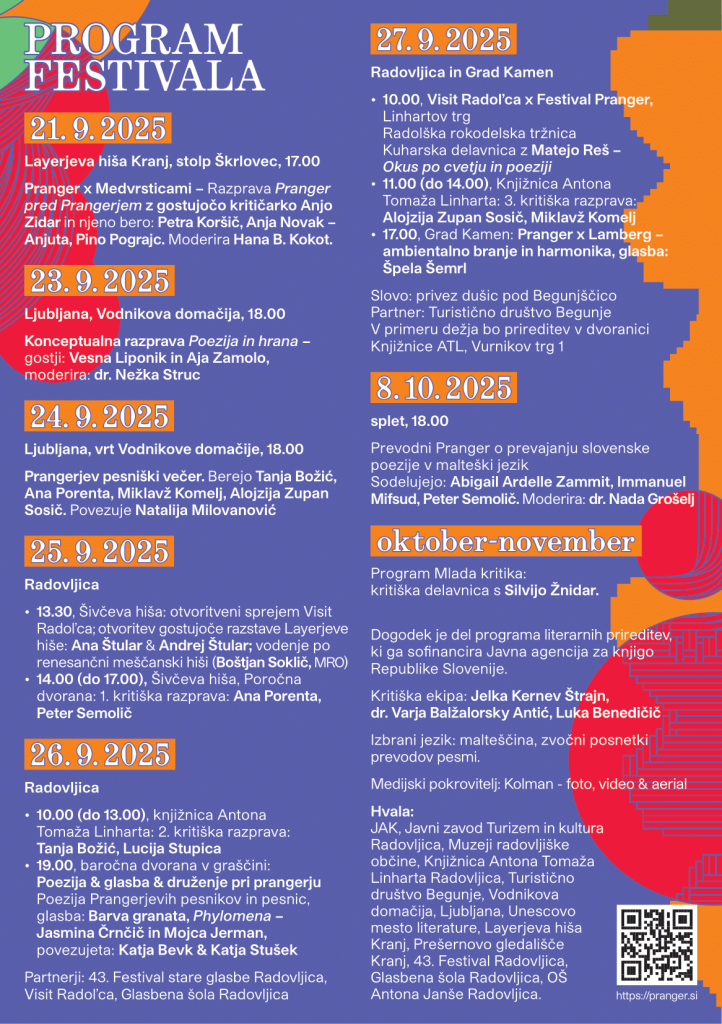 Osrednje pesniško branje v Radovljici organiziramo v sodelovanju s 43. Festivalom stare glasbe Radovljica. Skozi večer v radovljiški graščini nas bo peljal duo Katja Bevk & Katja Stušek. Slišali bomo pesmi iz Prangerjevih letošnjih izbranih zbirk v interpretaciji pesnikov in pesnic kot tudi glasbene interpretacije srednjeveške poezije. Za slednje bosta poskrbeli Jasmina Črnčič & Mojca Jerman iz ansambla Phylomena, ki si prizadeva karseda celostno predstaviti podobo časa, ki je v več kot enem oziru od našega sicer zelo oddaljen, hkrati pa po izrazitosti čustvovanja in predanosti lepoti življenja v svojem bistvu zelo blizu. Repertoar obsega dela iz srednjega veka 12. in 13. stoletja, avtorice Hildegarde iz Bingna, delo Minneleich Mojstra Alexandra (Der wilde Alexander) in pesem Pierra de Bloisa v stari francoščini. Za prevode sta poskrbela Domen Marinčič in dr. Alen Širca. Partnerja: Visit Radol’ca in 43. Festival stare glasbe Radovljica